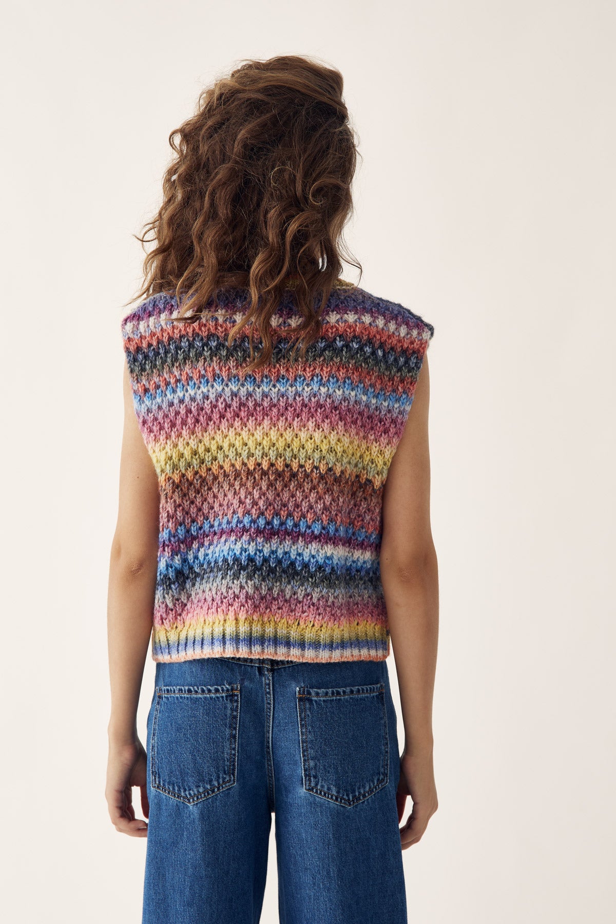 Gio Knit Vest er en kraftig vest lavet i 53 uld. Den har et løst fit, og er perfekt til lag-på-lag styling. Hvert produkt er unikt på grund af indfarvningsprocessen af garnet, som kan skabe variationer fra produktion til produktion.