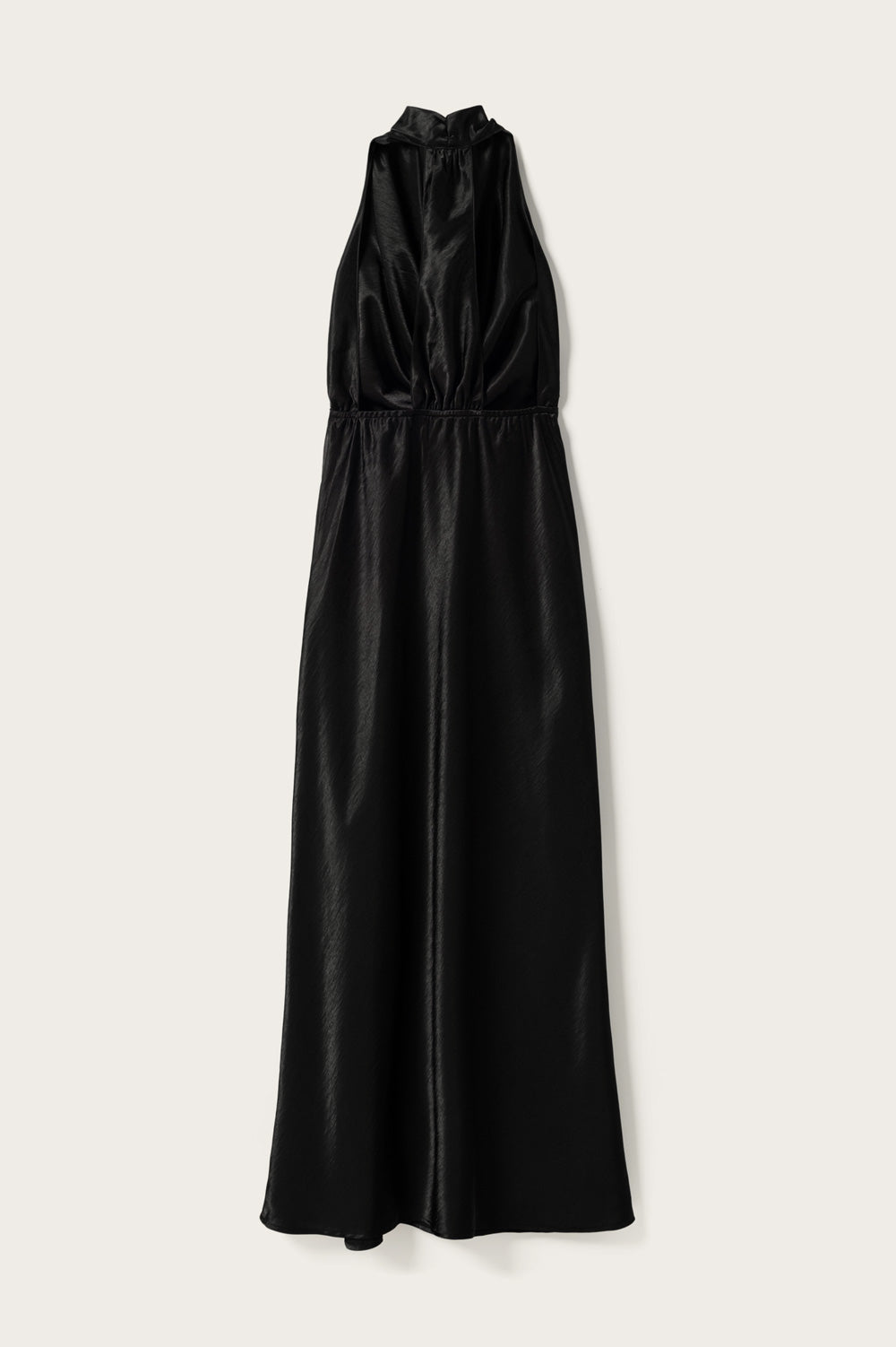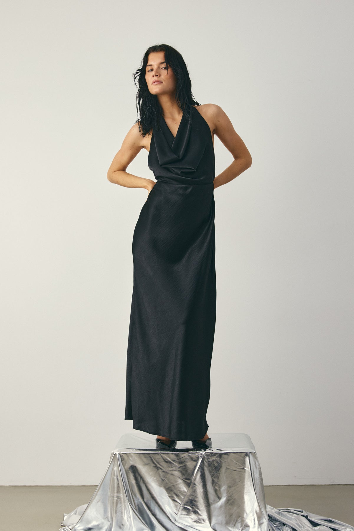 Lanika Dress er en smuk lang kjole i satin med elegant waterfall-cutline foran. Lanika Dress er perfekt til festlige lejligheder og kan styles med hæle og en cool taske for et sofistikeret look.