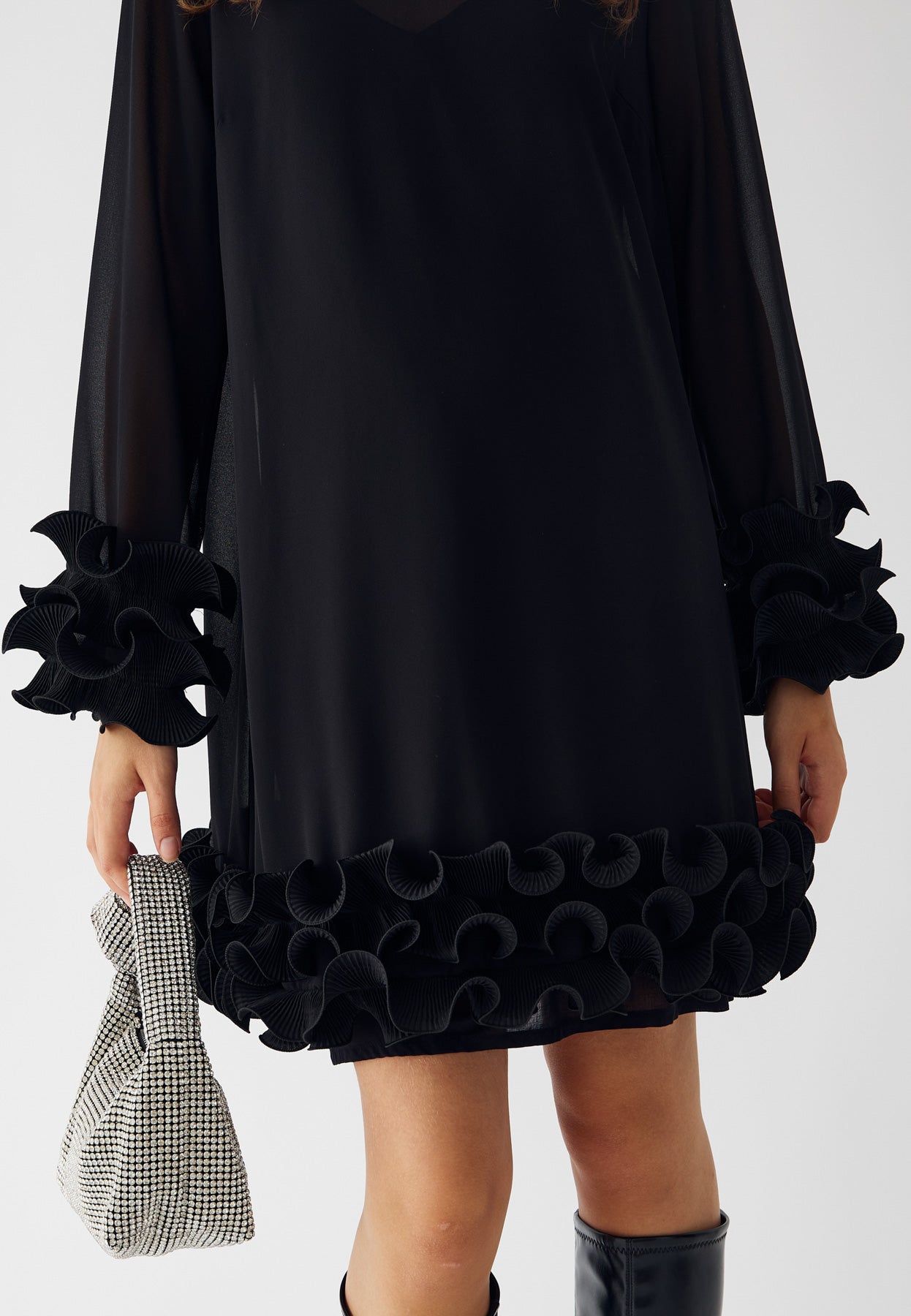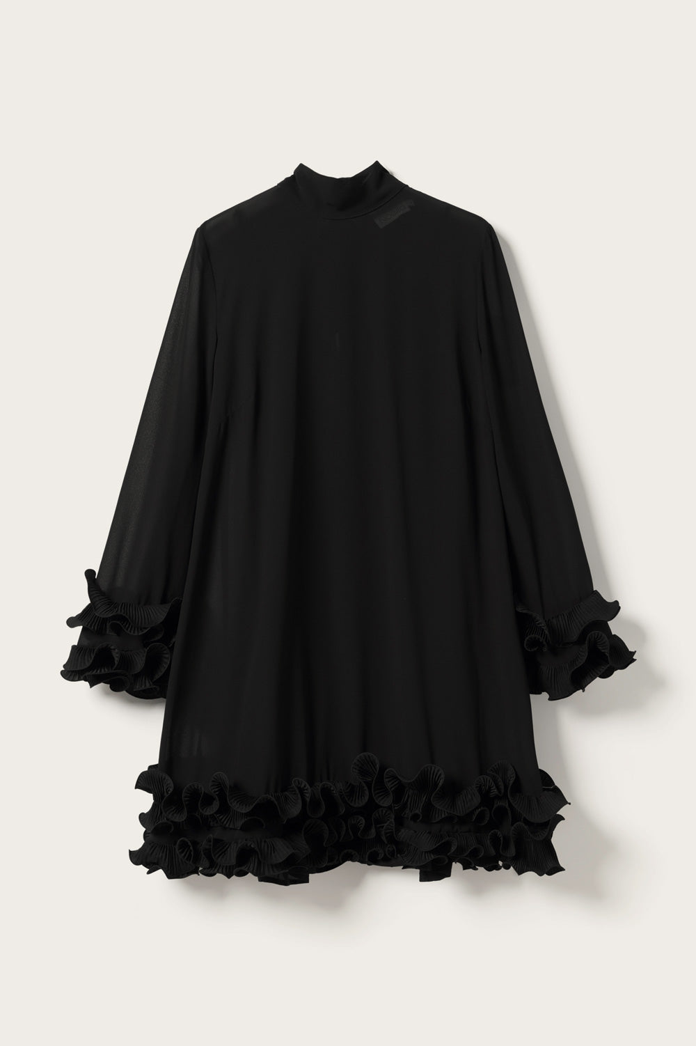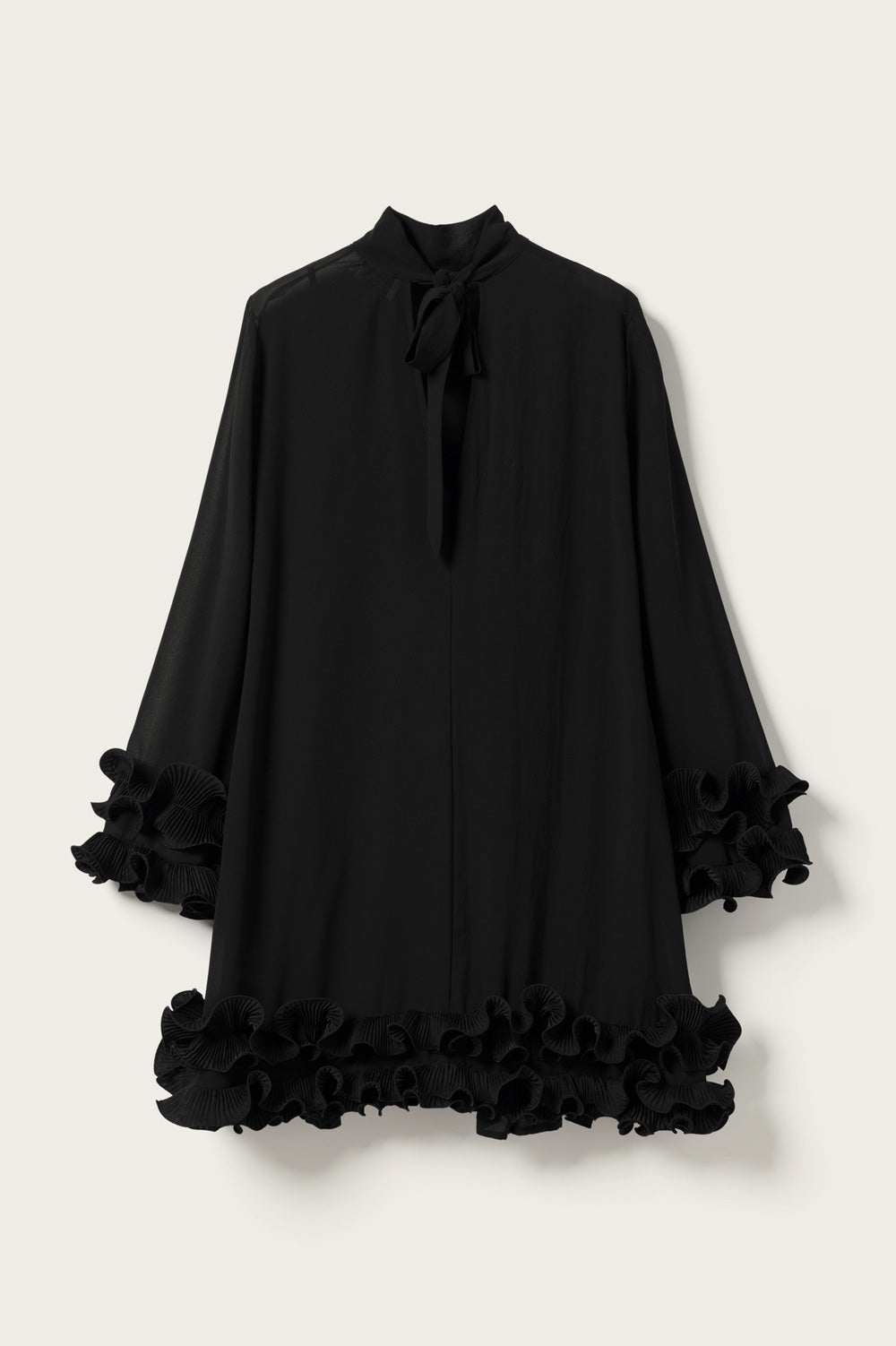 Latania Dress er en kort sort kjole med finere flæsedetaljer ved kanter. Kjolen har en løs pasform, med en høj rund hals hvor lukningen er med en sløjfe.