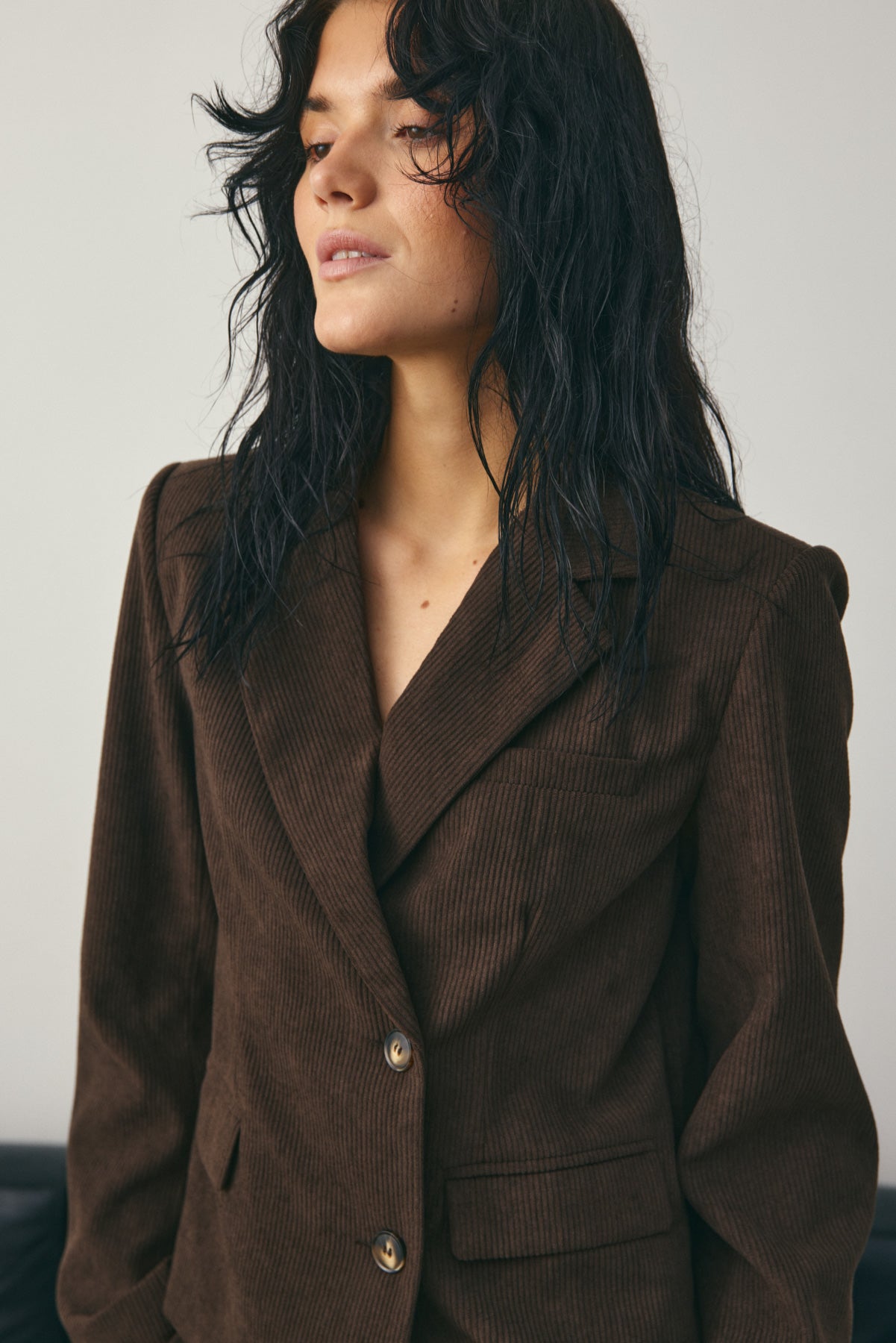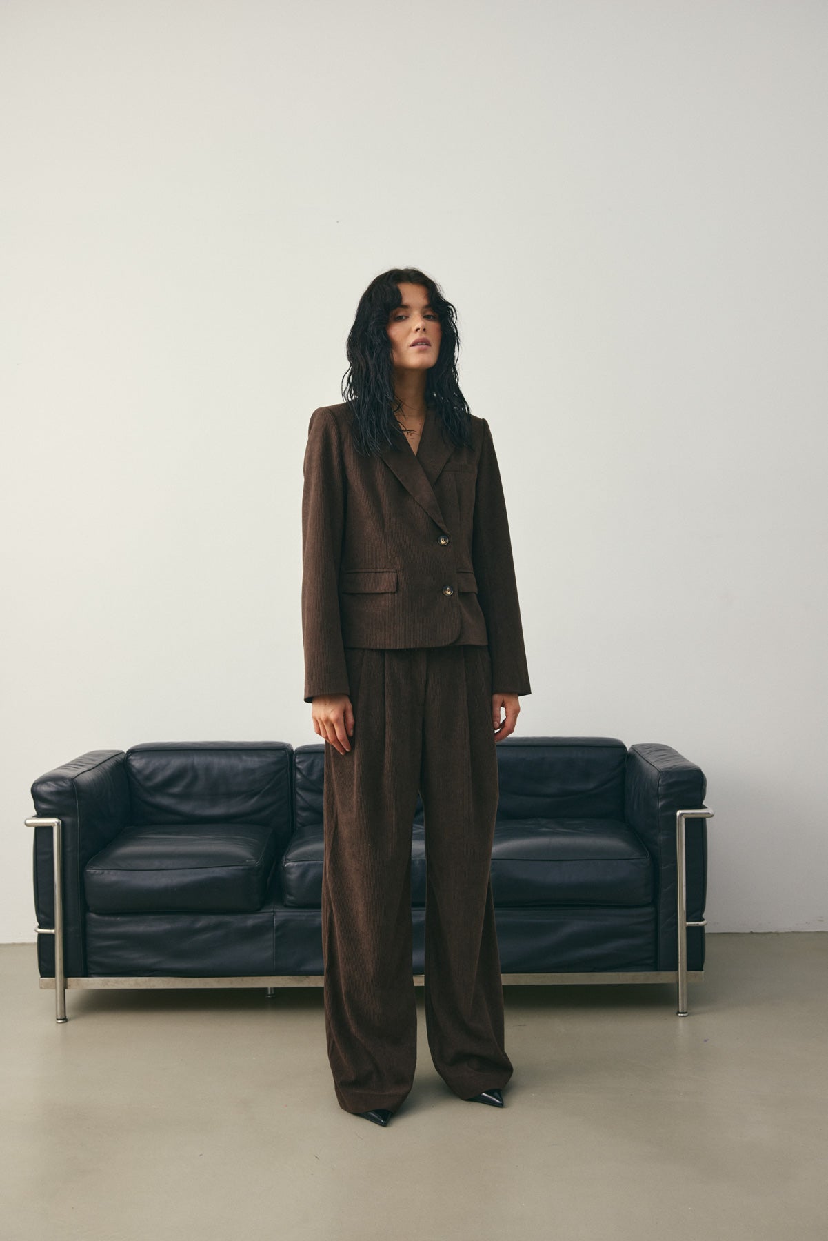 Laur Blazer er en Blazer i kort design med asymmetrisk snit og klassiske fløjlstrukturer. Laur Blazer kan styles med Lusia Pants i samme materiale for et sæt-look eller med jeans for et moderne hverdagsoutfit.