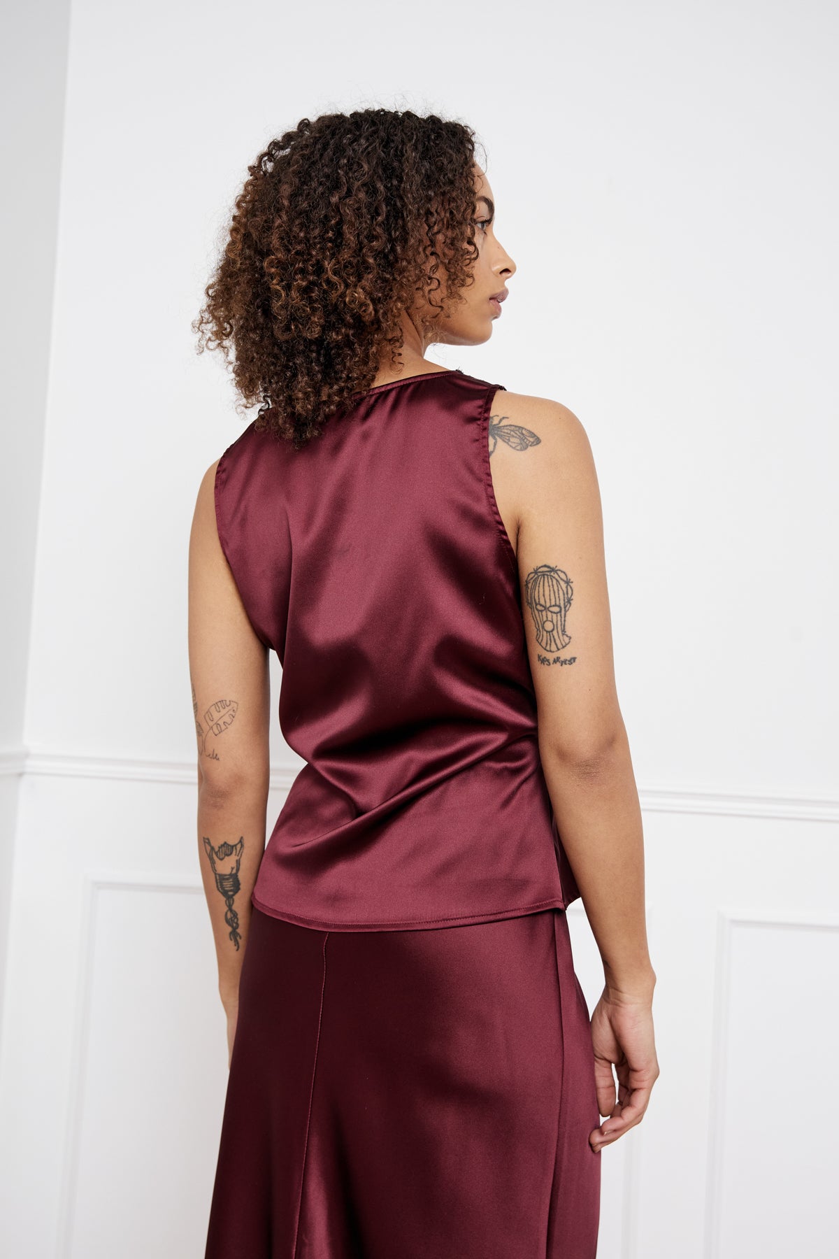 Laurentina Blouse er en ærmeløs bluse i silke-look med blondekanter foran og ved skuldrene, som giver et feminint og let look. Blusen har en let pasform, som giver et enkelt og stilfuldt udtryk. Brug den med vores Leonora Skirt eller med jeans og en blazer.