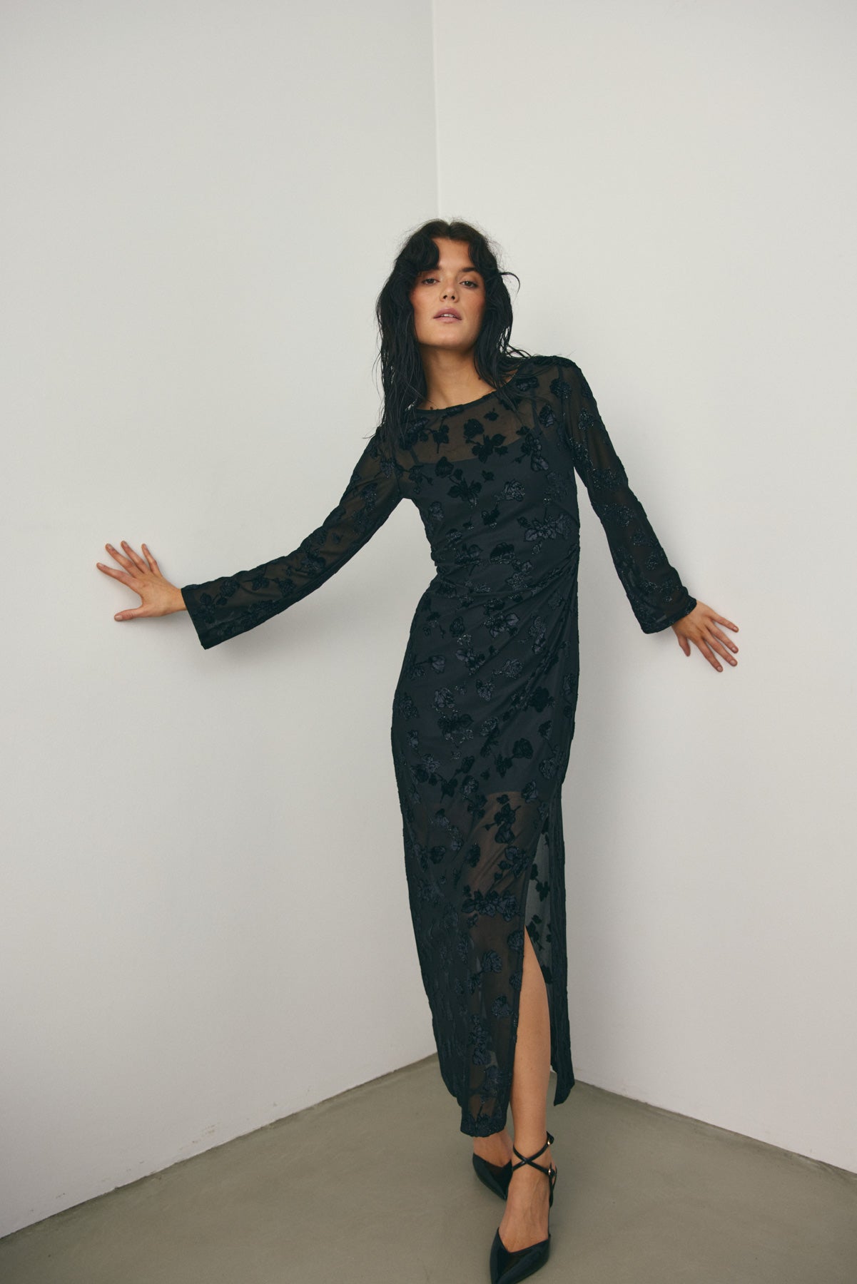 Laurette Dress er en lang kjole med lange ærmer og slids i siden. Laurette Dress har implementeret blomsterprint i stoffet, som giver et eksklusivt udtryk. Style Laurette Dress med hæle og en fin taske til festlige lejligheder for et elegant og stilet look.