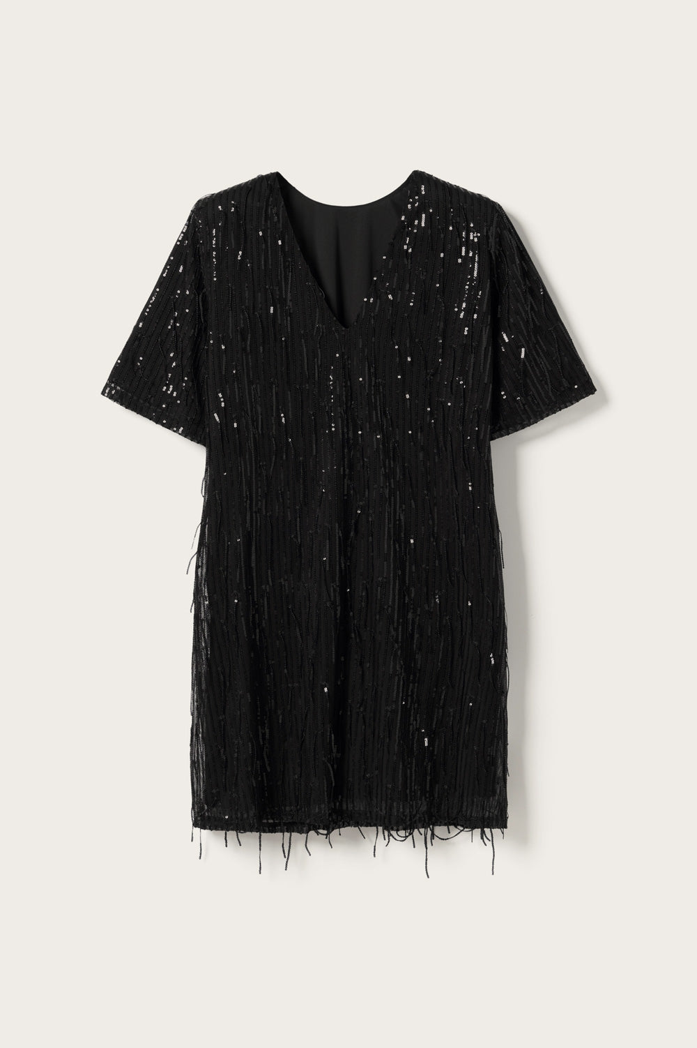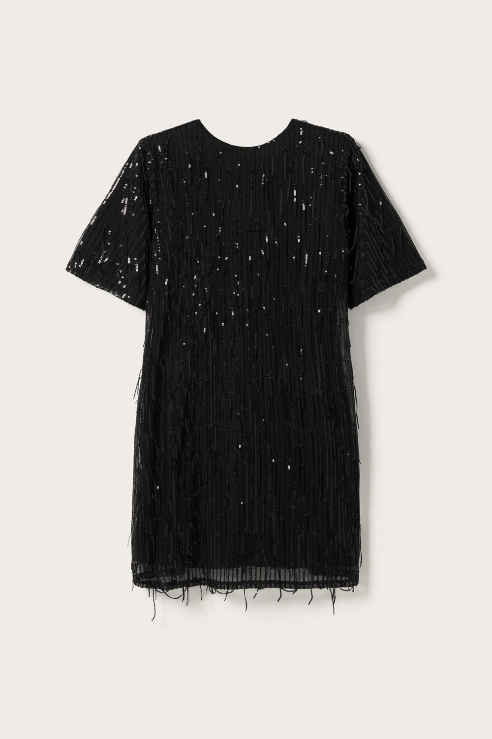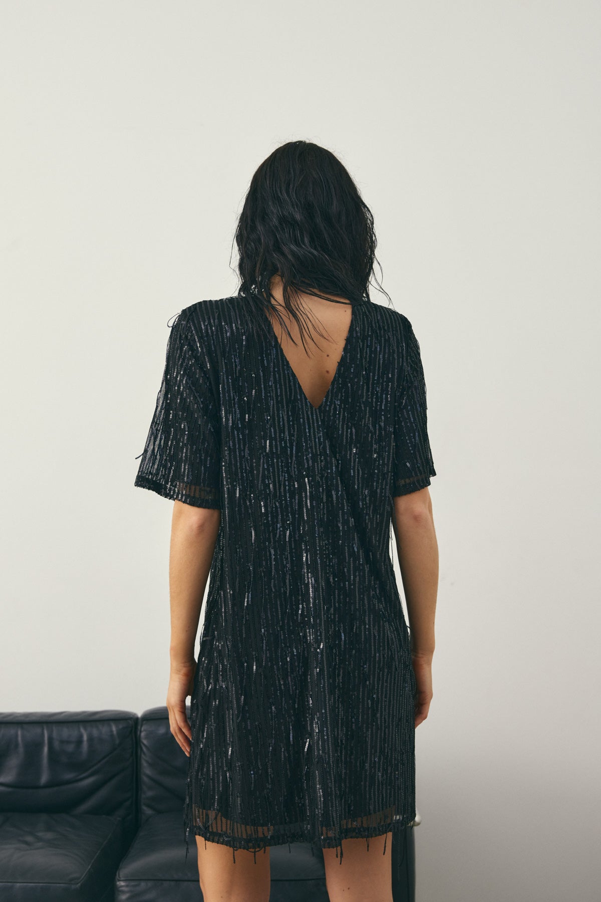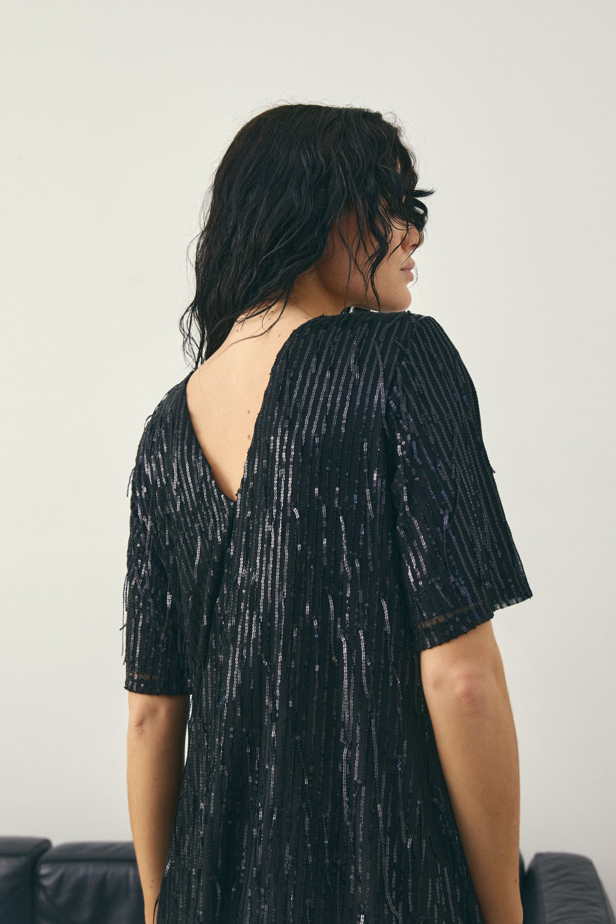 Leeann Dress er en kort T-shirt kjole med pailletter og dyb V-udskæring ved ryggen. Leeann Dress er Perfekt til festlige lejligheder og kan styles med hæle og en cool taske for et stilet partylook.