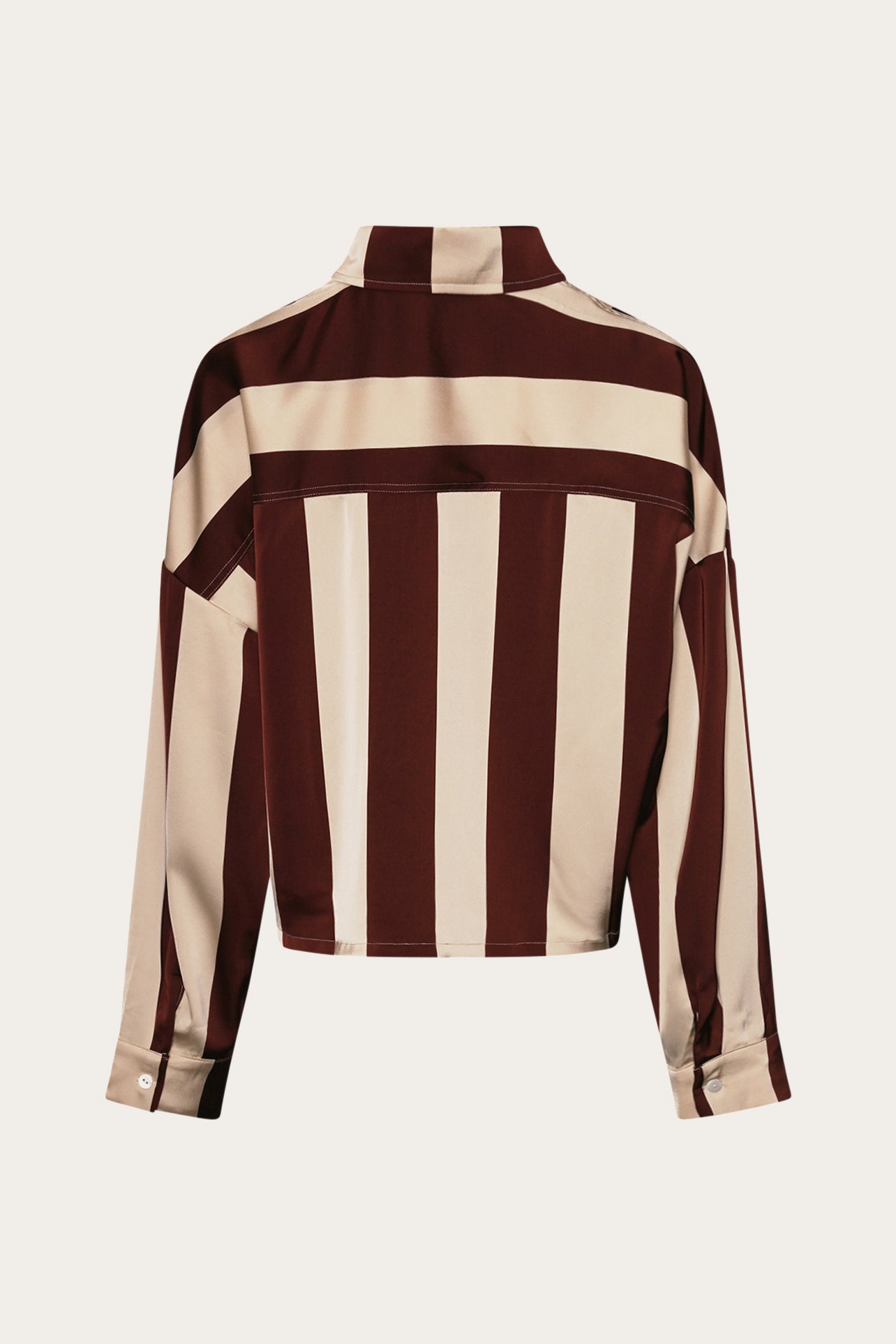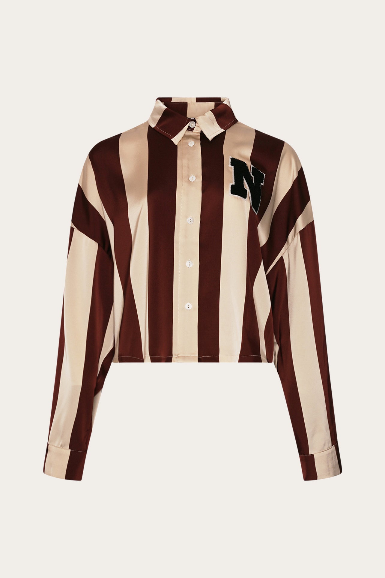 Liara N Shirt er en langærmet skjorte i et silke-look med stribet mønster, påsyet motiv og knapper foran. Skjorten har en løs pasform, som giver et afslappet og enkelt look. Kan styles med både busker for et hverdagslook og med nederdel for et mere festligt look.