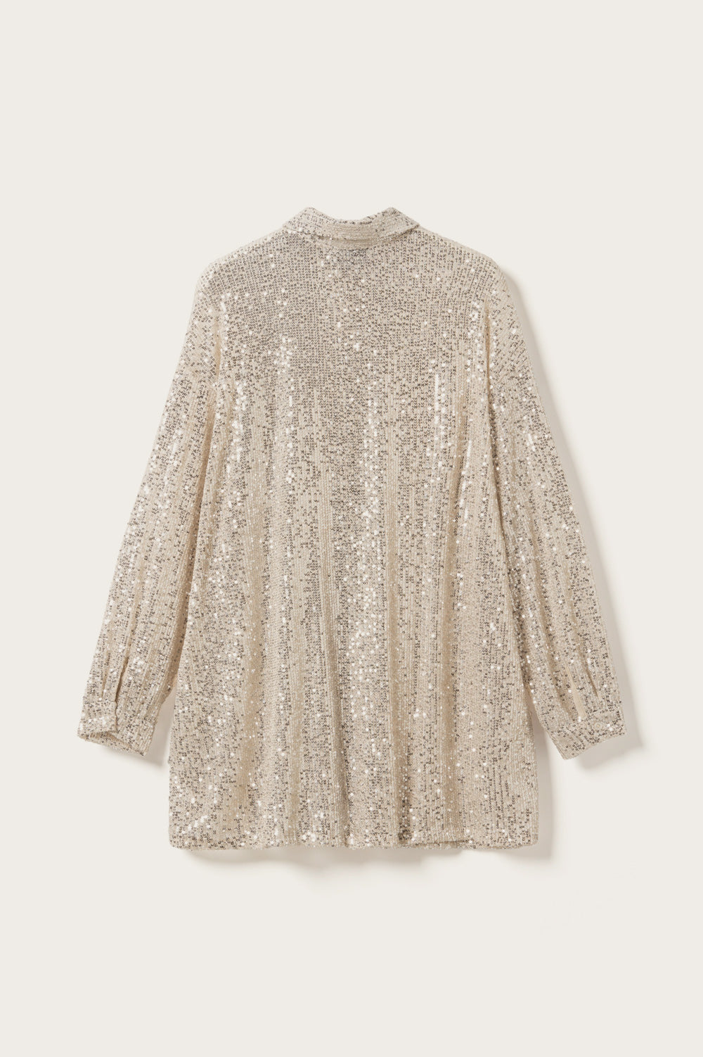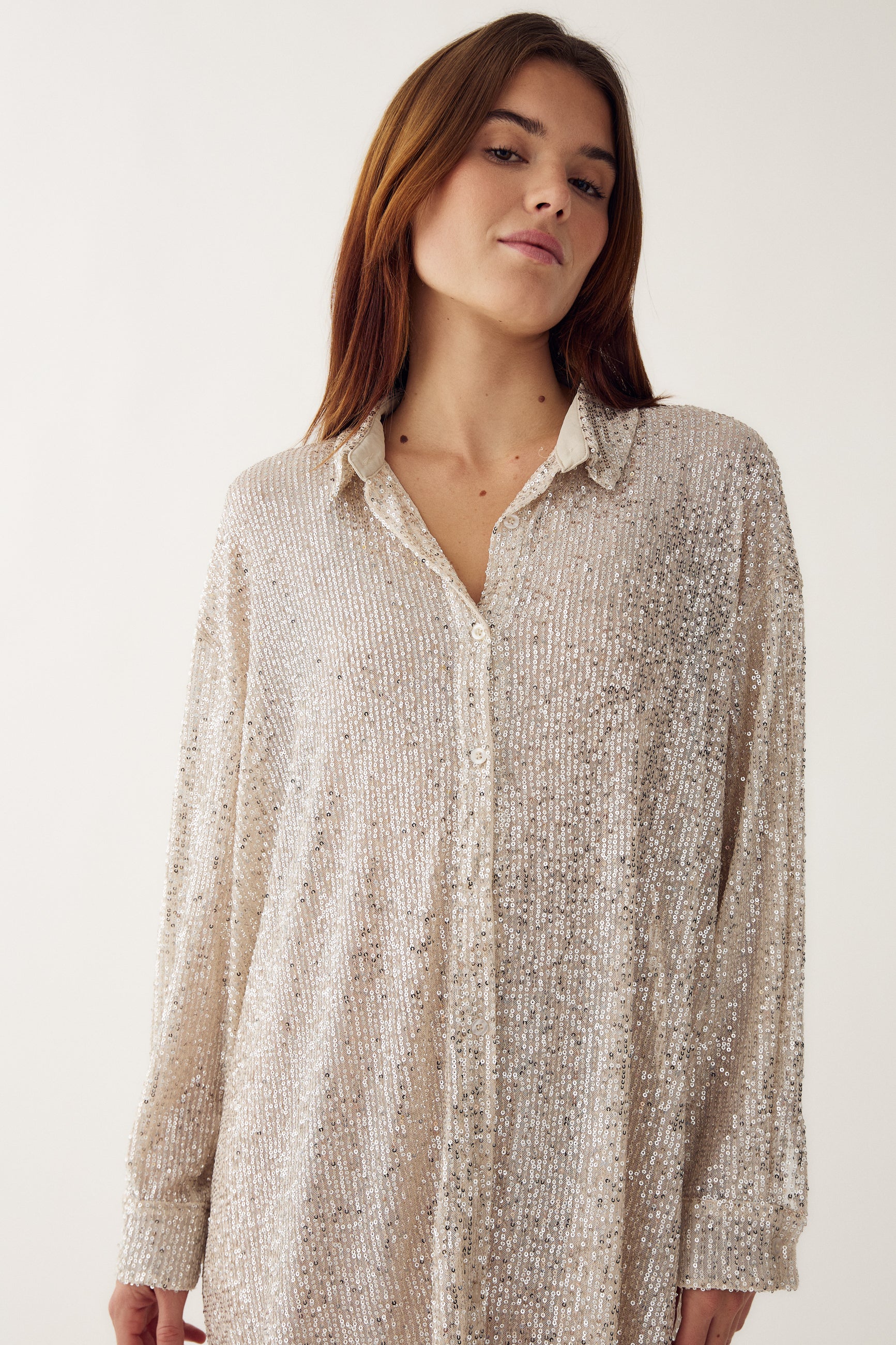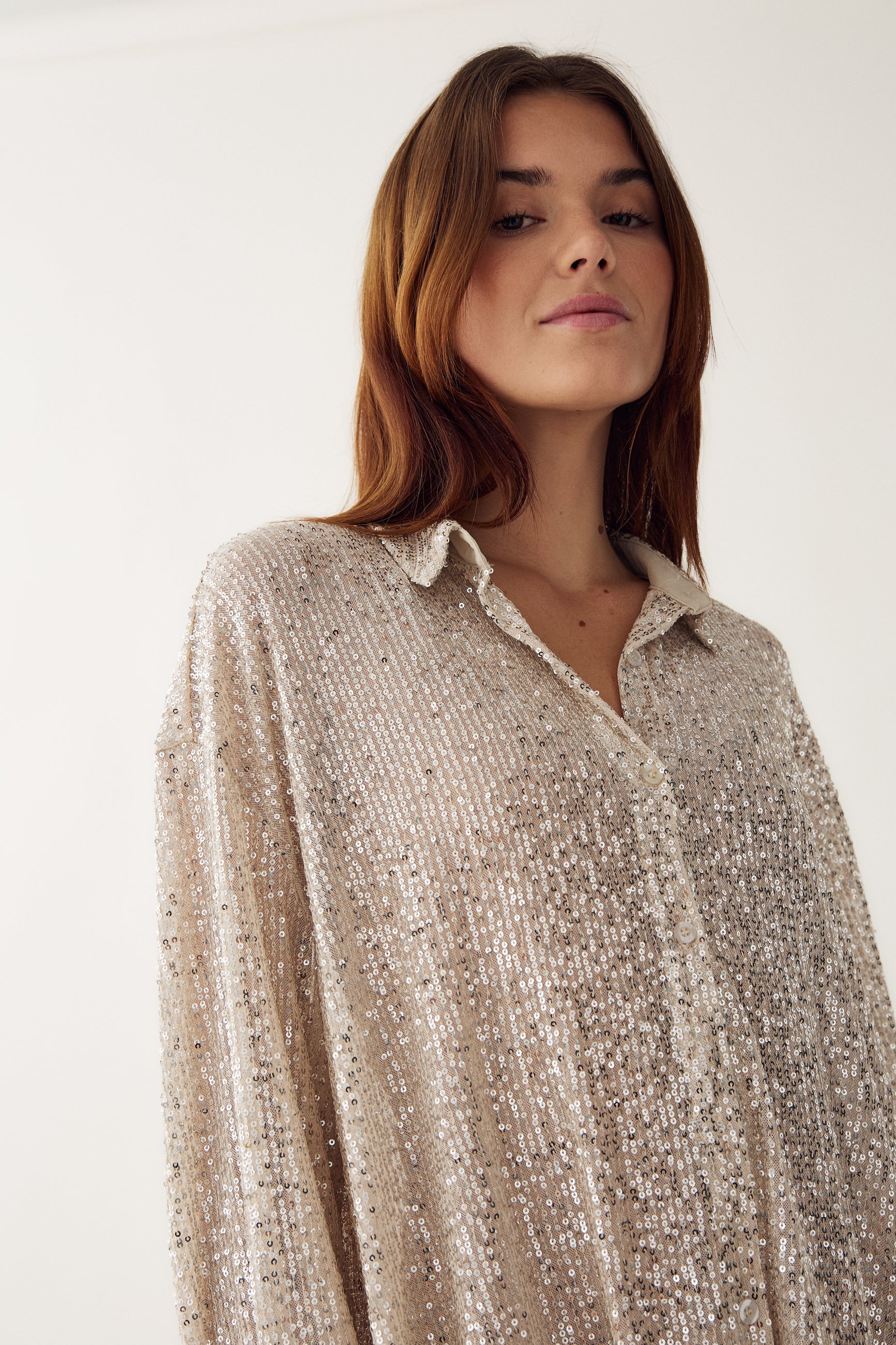 Lizanne Shirt er en pailletskjorte med lange ærmer, klassisk krave, knappelukning og et loose fit.
