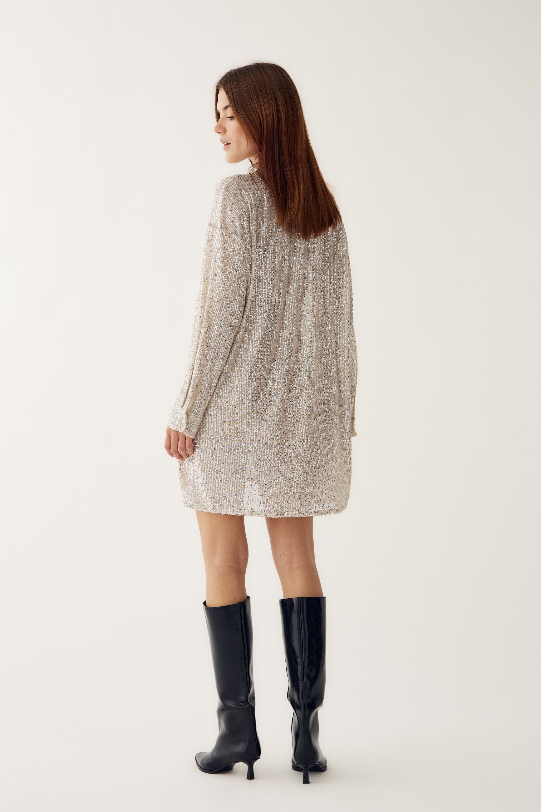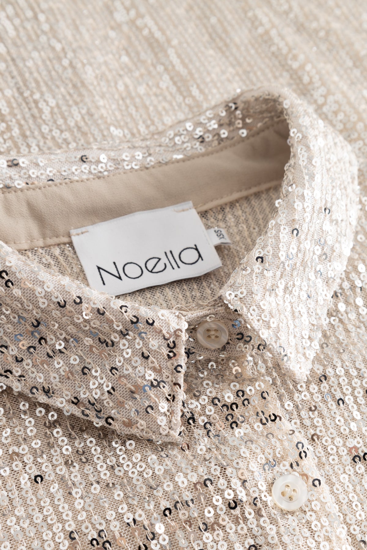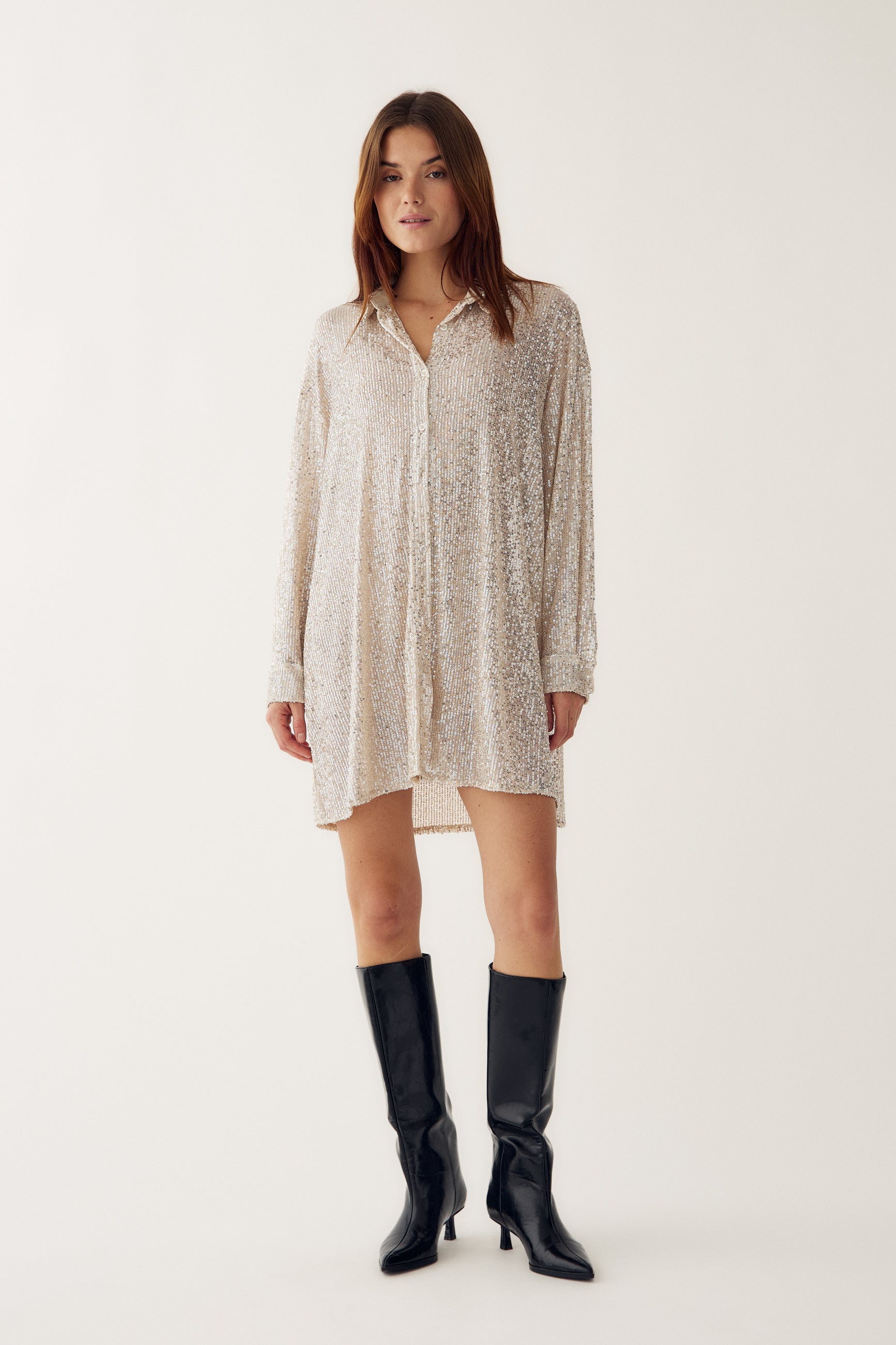 Lizanne Shirt er en pailletskjorte med lange ærmer, klassisk krave, knappelukning og et loose fit.