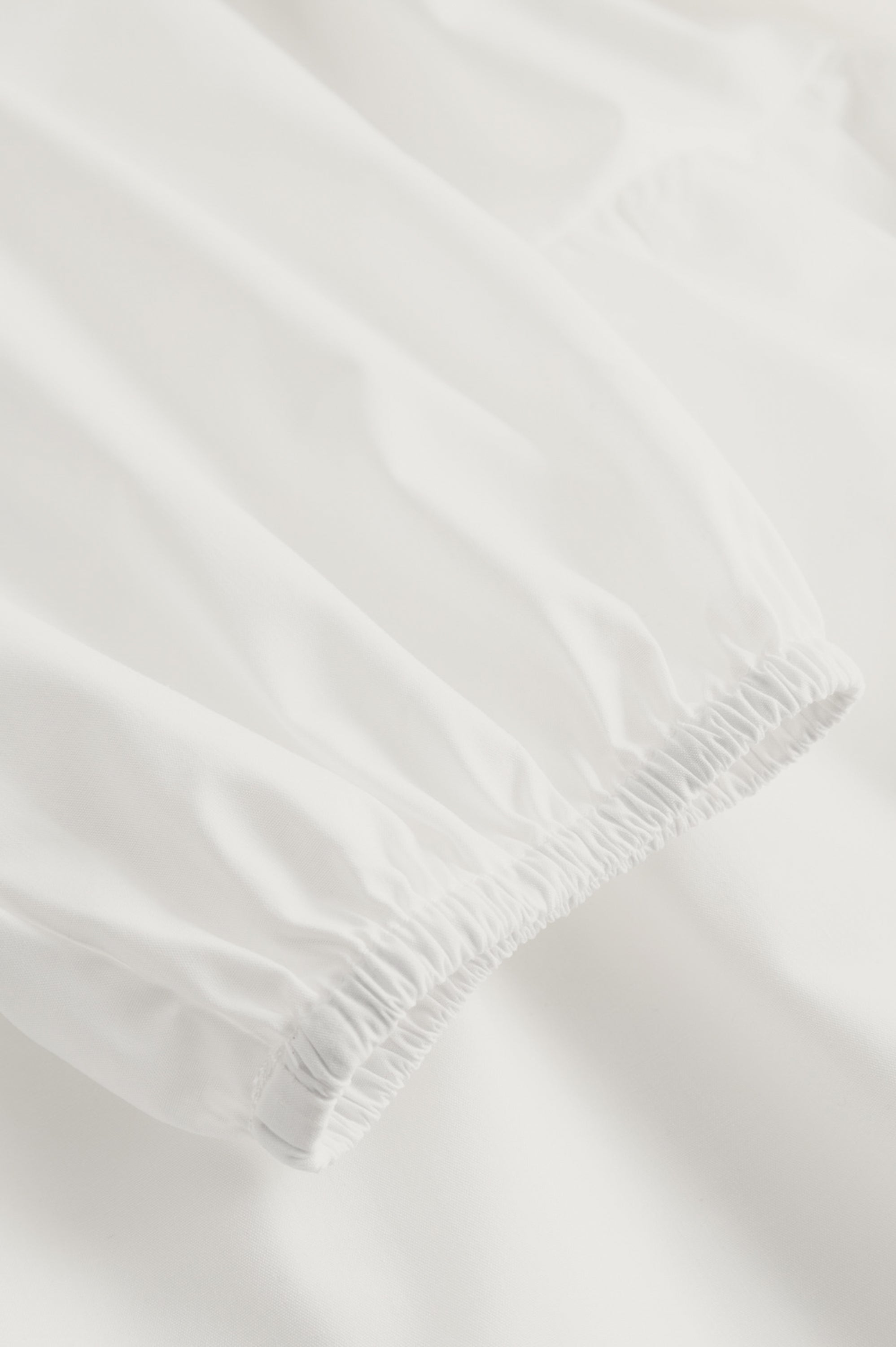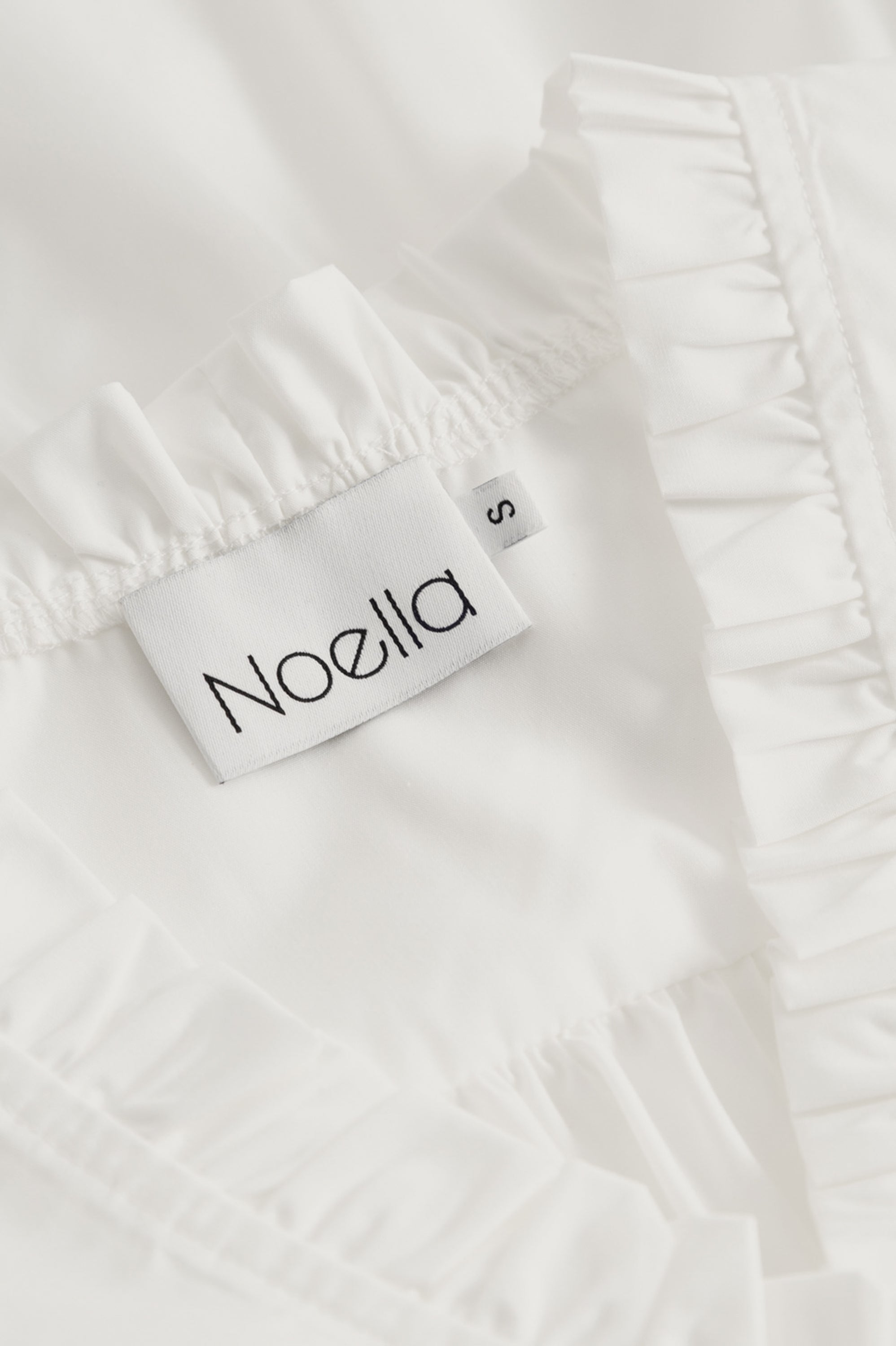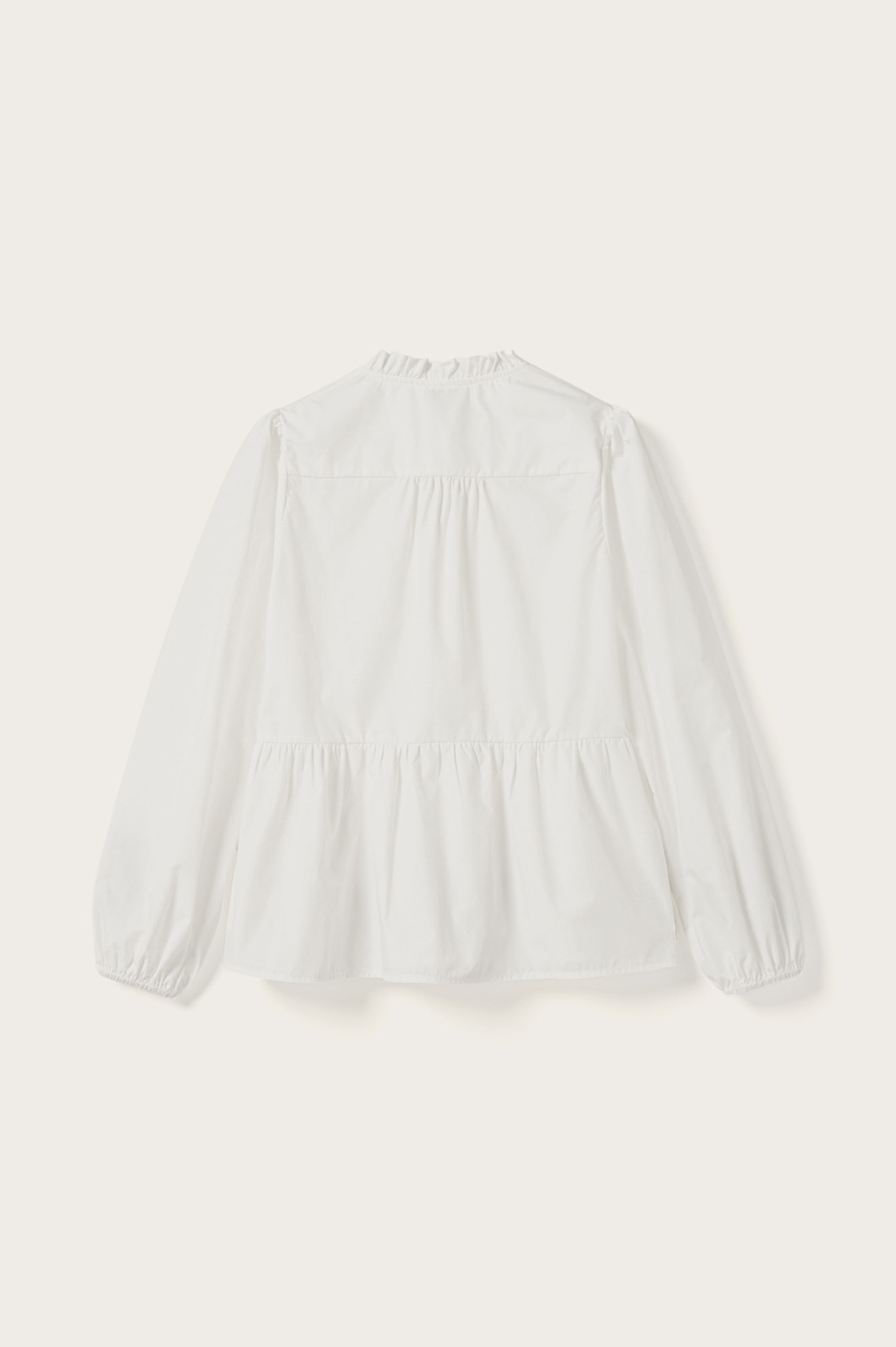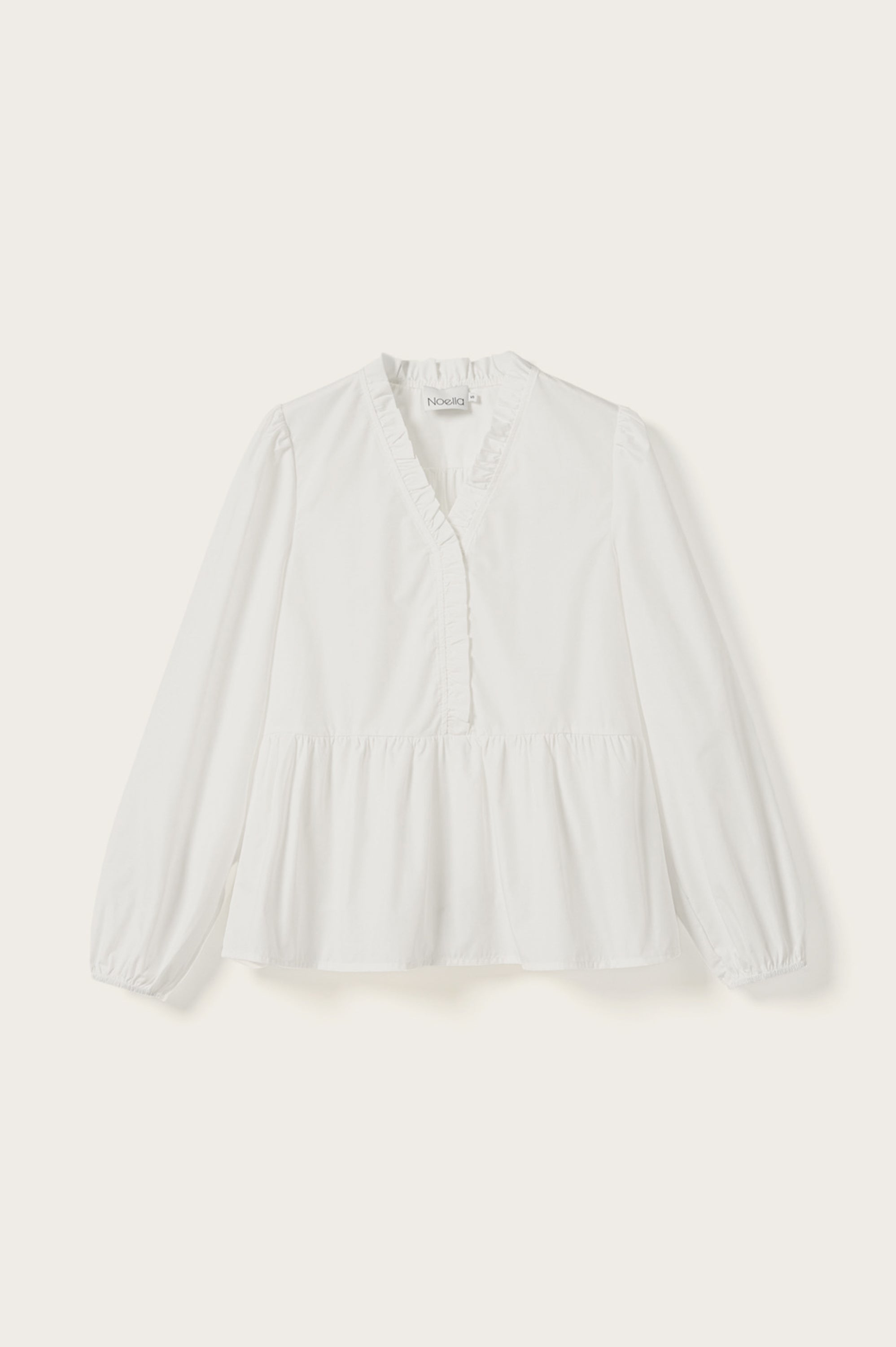 Matti Blouse er en bluse med broderidetaljer, V-hals med flæser, sømninger ved taljen og elastik ved ærmerne.