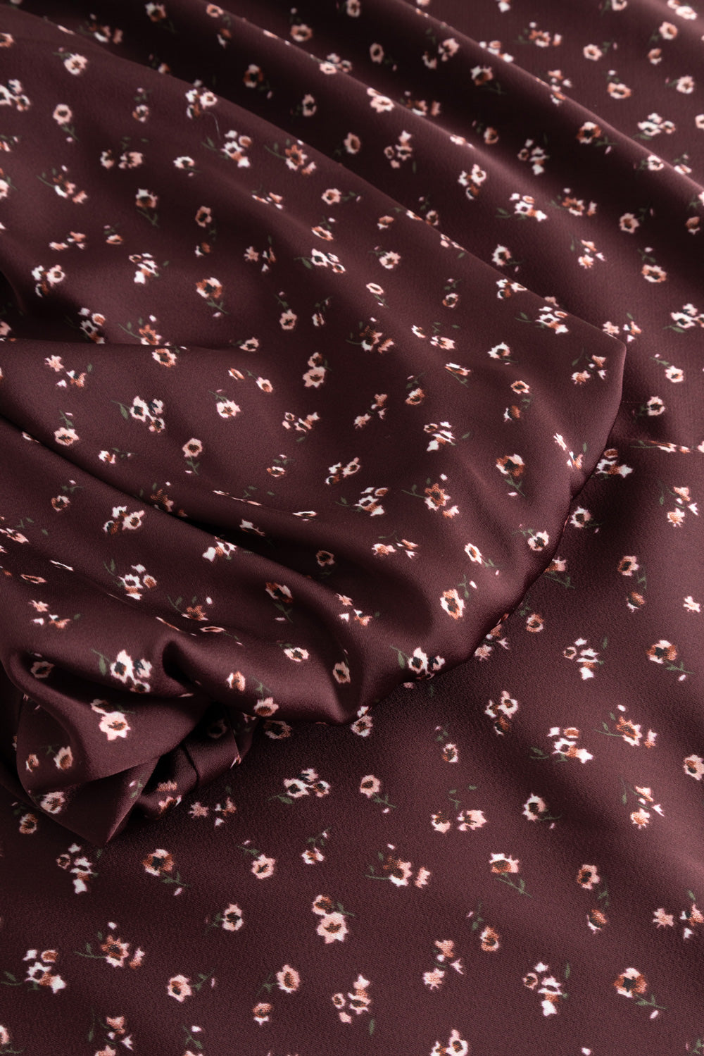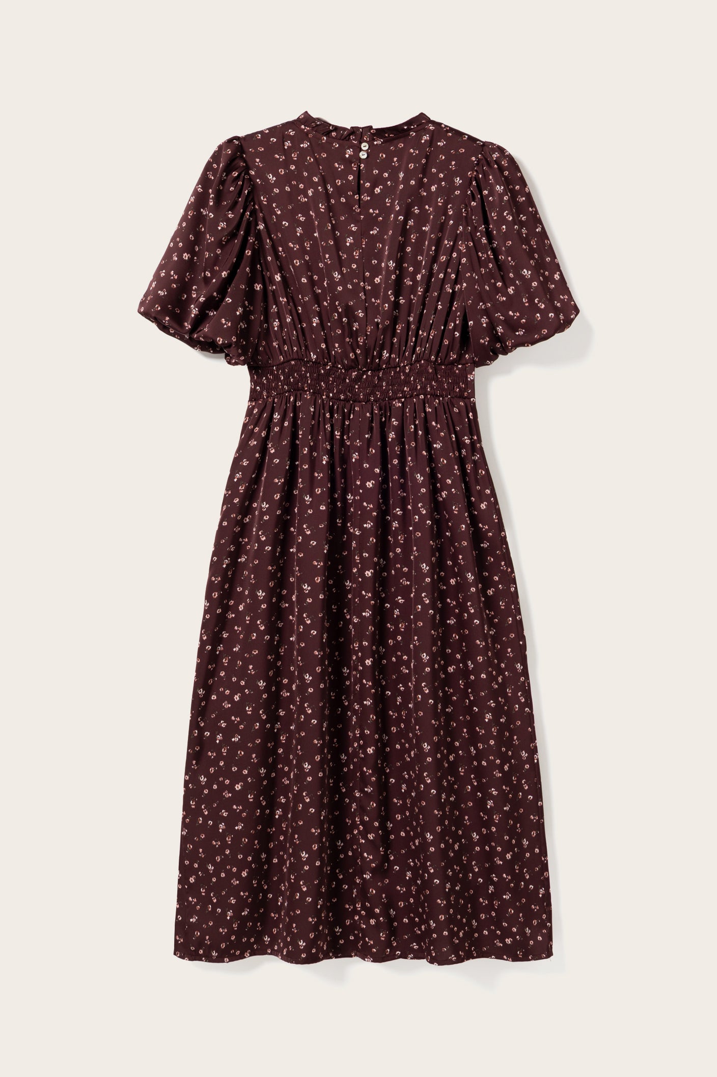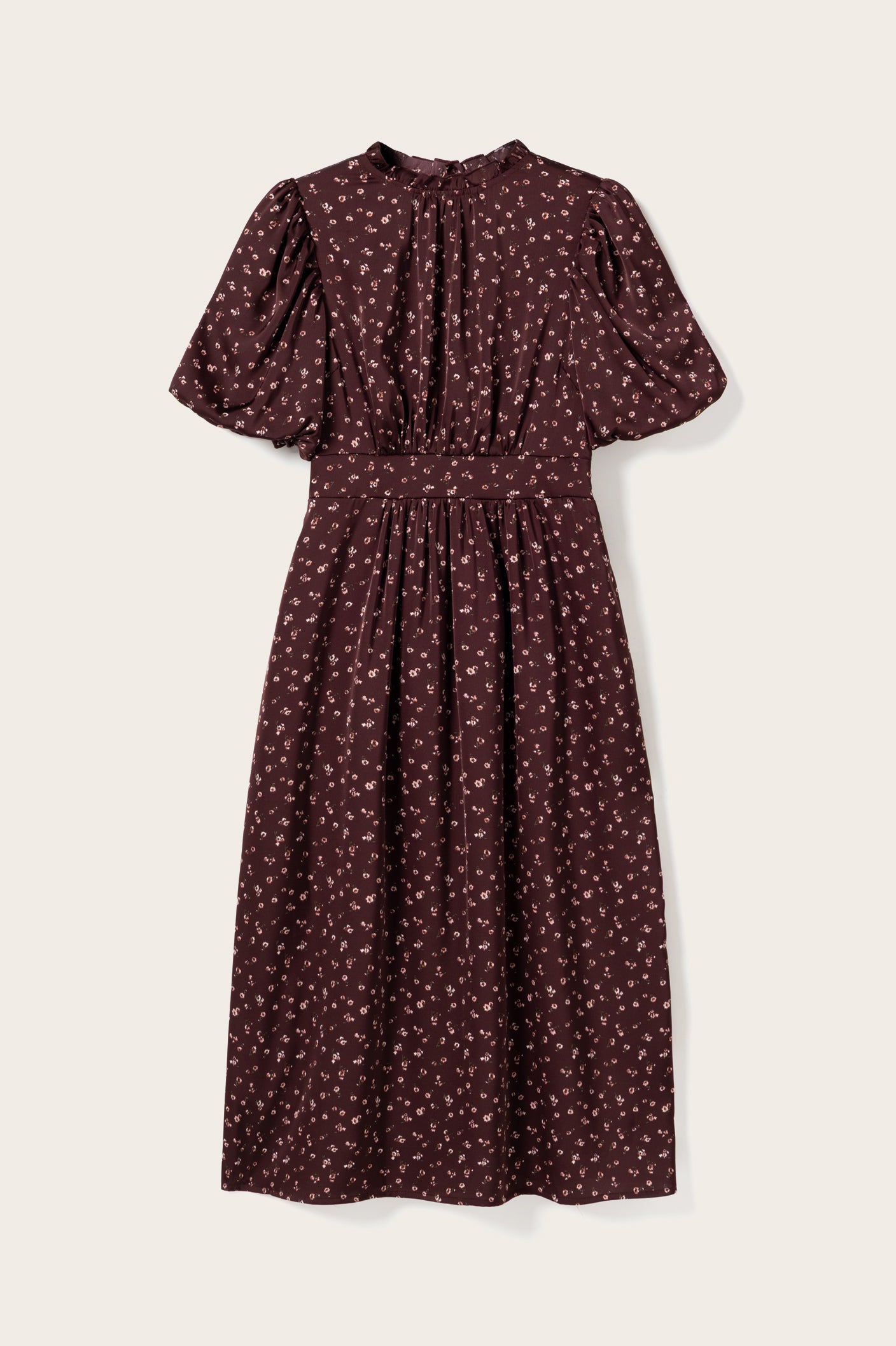 N-Ruth Dress is a long, flowy silhouette featuring puffed sleeves and a cinched waist that flatters the figure. The dress is designed with a ruffled collar and an all-over floral print.